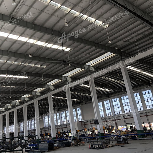 示例圖為湖南一家國(guó)有企業(yè)生產(chǎn)機(jī)電零部件車間,典型的鋼結(jié)構(gòu)建筑。長(zhǎng)度150米, 寬度72米面積10800平米共三跨。 屋面離地高度15米,在沒有吊扇改造前,工廠采用98臺(tái)工業(yè)小風(fēng)扇(強(qiáng)力風(fēng)扇,牛角扇)改善員工工作環(huán)境。 然而高溫季節(jié),環(huán)境溫度34-39度時(shí), 部分小風(fēng)扇應(yīng)用覆蓋距離和面積有限, 部分員工近距離靠著小風(fēng)扇長(zhǎng)時(shí)間強(qiáng)風(fēng)環(huán)境下產(chǎn)生不適反應(yīng),原有的通風(fēng)降溫不能解決問題, 另外隨著工廠安全管理需要小風(fēng)扇由于電纜和潛在靠近旋轉(zhuǎn)扇葉的風(fēng)險(xiǎn)也不適應(yīng)工廠未來發(fā)展工廠需要有一個(gè)性價(jià)比高的通風(fēng)降溫解決方案,  根據(jù)工廠要求, 奧寶杰實(shí)地了解原有車間環(huán)境, 從廠房面積, 高度, 設(shè)備人員布局的整體考慮,優(yōu)化吊扇布局和氣流, 使用了18臺(tái)奧寶杰(Apogee) TM-7300 (直徑7.3米)進(jìn)行環(huán)境改善。